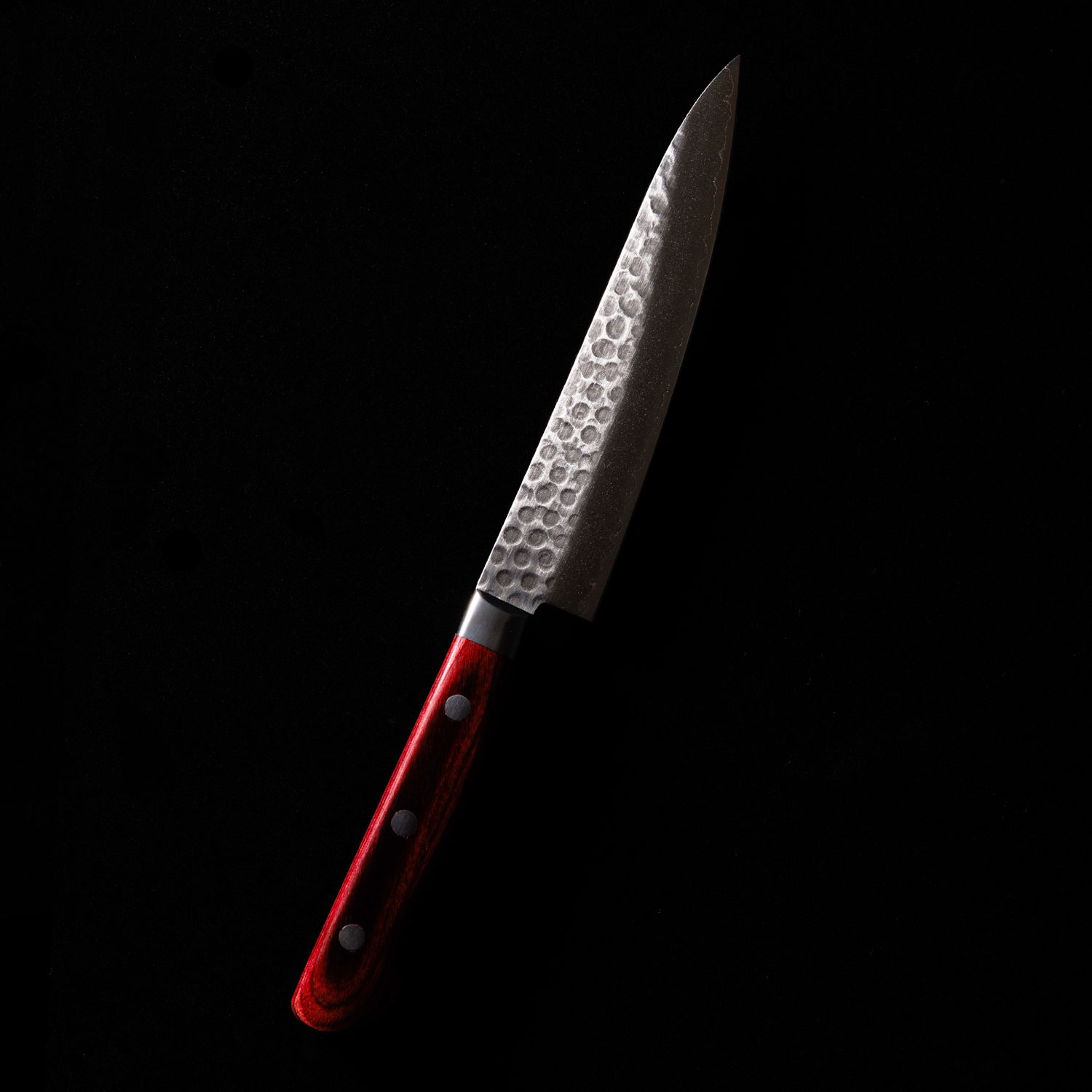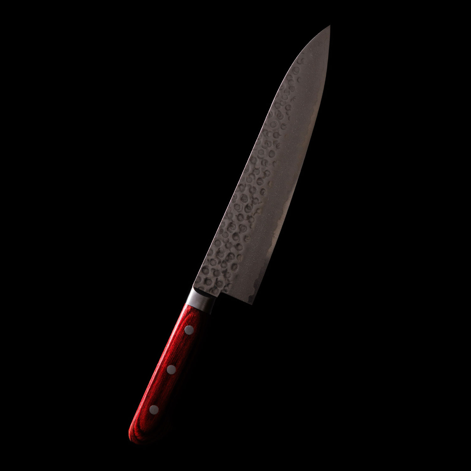 槌目模様を施した高級ステンレス材であるVG10三層鋼のブレードです。 三色のカラーハンドルでご用意致しました。万能包丁としてお使いいただけます。